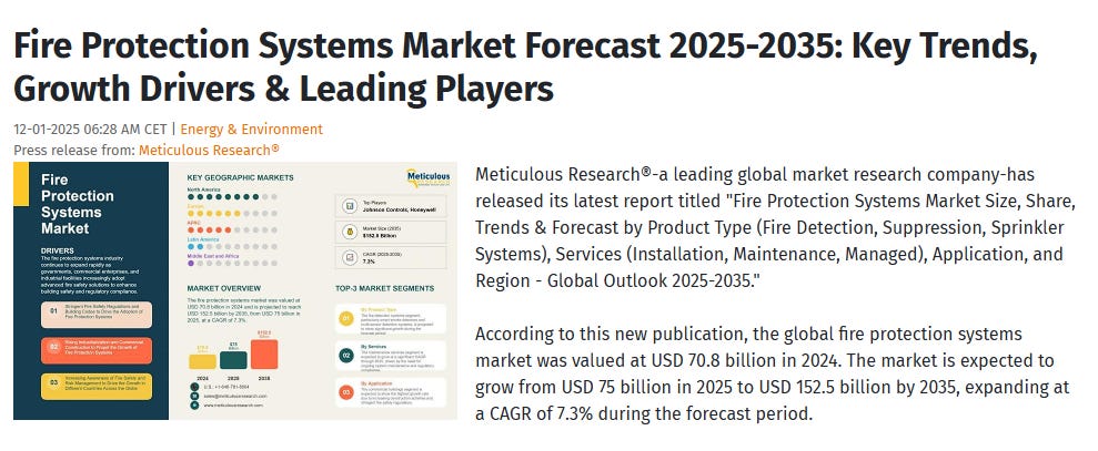 Um novo relatório de mercado mostrou que os sistemas de proteção contra incêndio devem praticamente dobrar até 2035, saltando de 75 para 152 bilhões de dólares. E isso não é só uma curiosidade econômica; é um recado claro de como a prevenção é tratada lá fora: como infraestrutura essencial.
